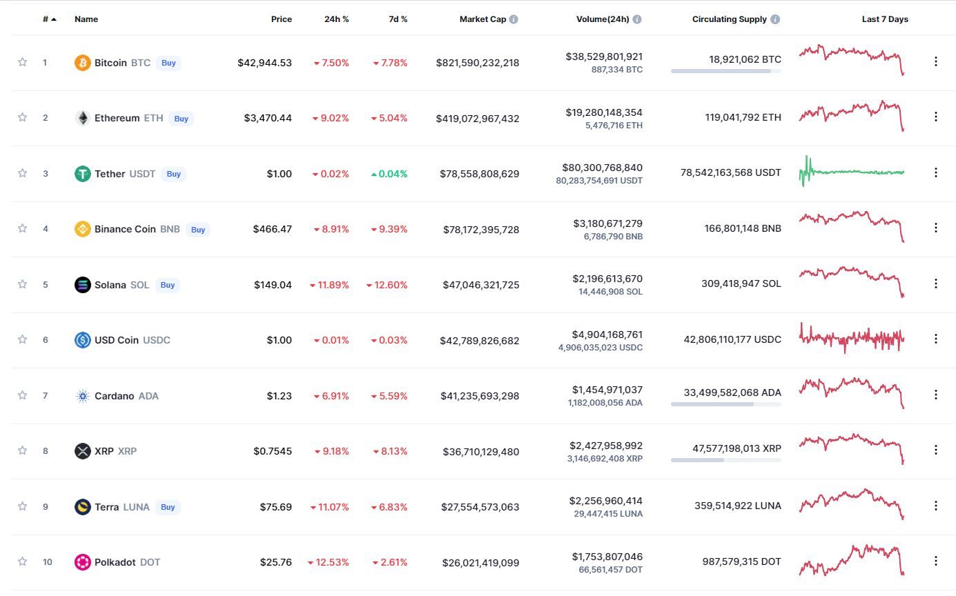 В топ-10 самых капитализированных криптовалют все монеты, за исключением стейблкоина Tether, продемонстрировали отрицательную динамику движения за сутки и неделю. Наибольшие потери в рамках 24 часов зафиксированы у Polkadot (-12,53%). В течение последних 7 дней активнее других терял в цене Solana (-12,60%).