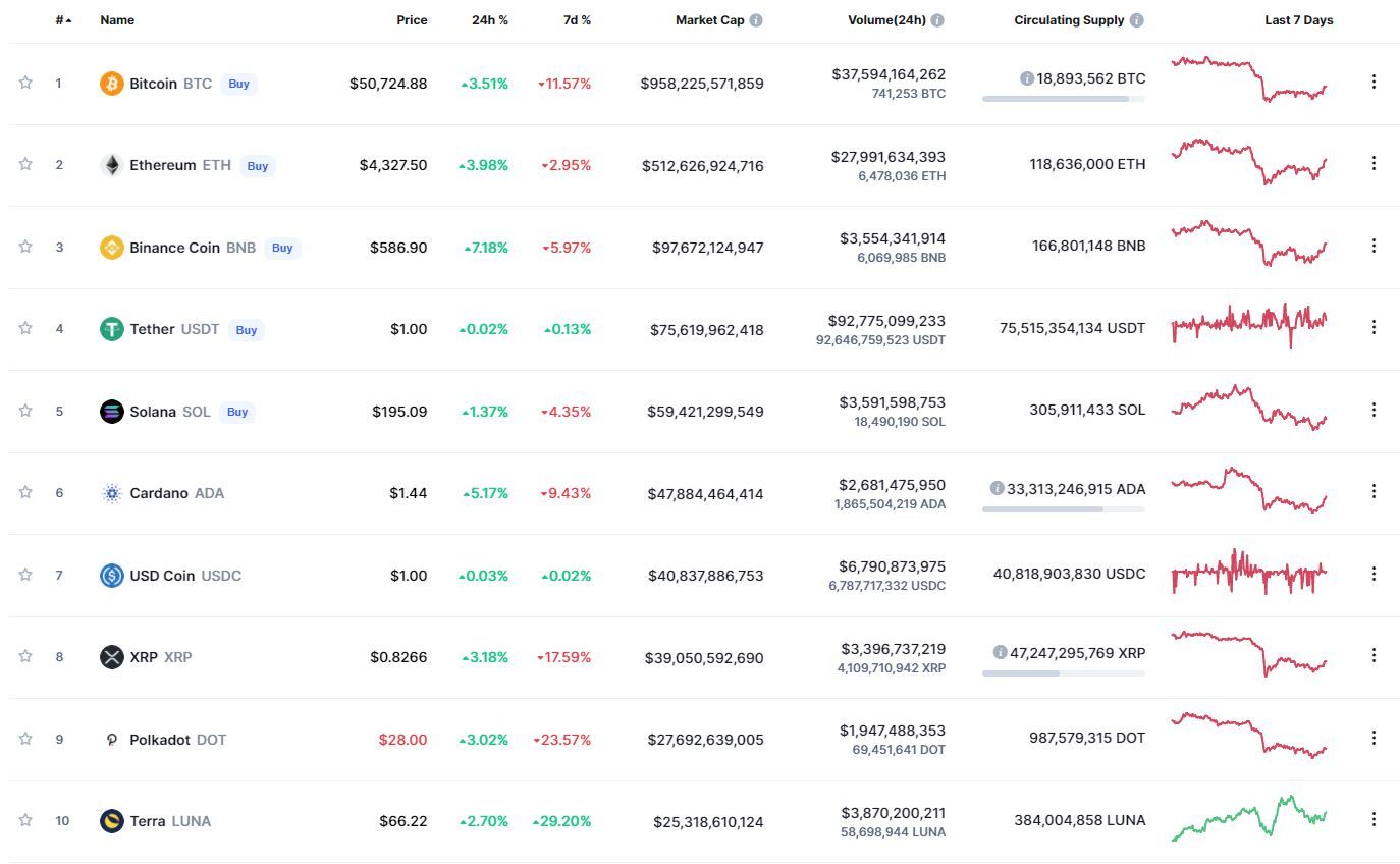 Лучший результат за сутки в топ-10 криптовалют зафиксирован у Binance Coin (+7,18%). В рамках недели активнее других рос Terra (+29,90%). В течение 24 часов все криптовалюты из топ-10 продемонстрировали позитивную динамику движения. Наибольшие потери зафиксированы у Polkadot (-23,57%).