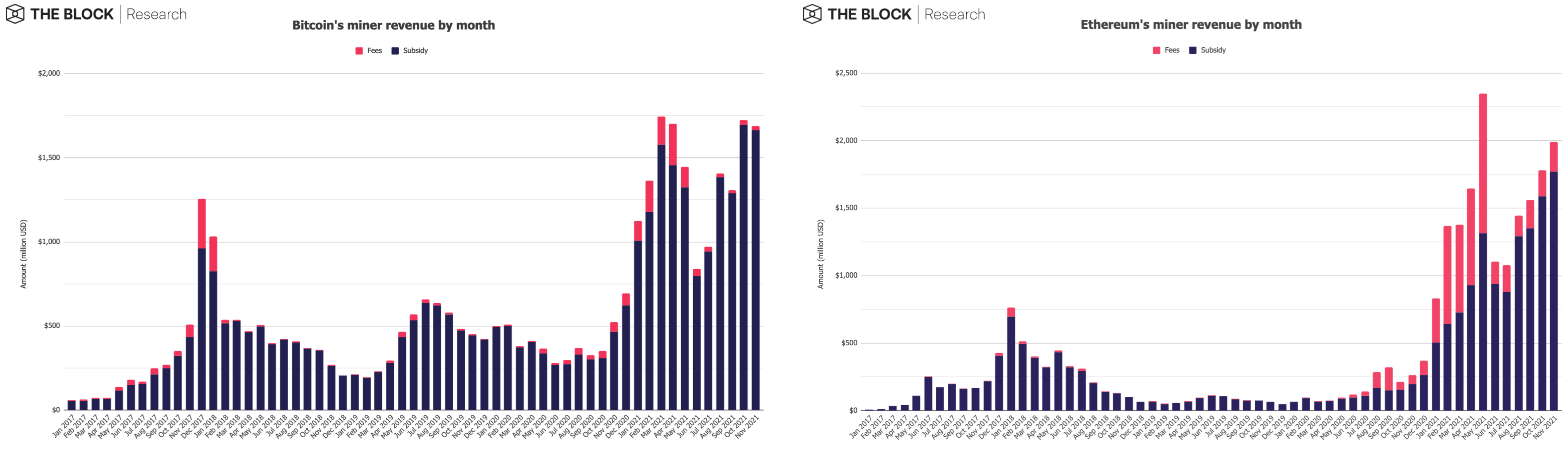 Также статистика говорит о том, что заработок майнеров на комиссиях, сгенерированных в сети Ethereum, превосходит показатели биткоина.