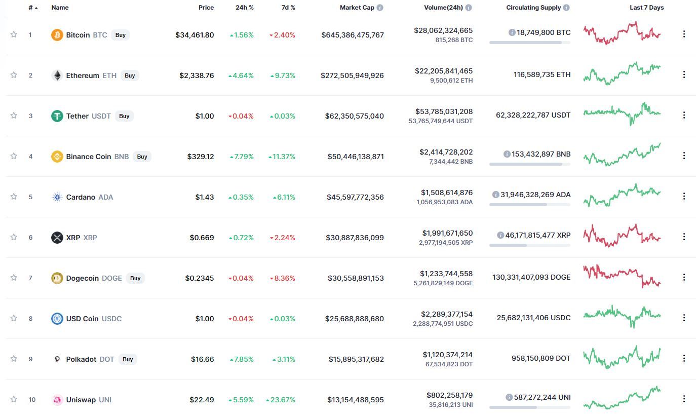В топ-10 самых капитализированных криптовалют лучший результат движения за сутки продемонстрировал Polkadot (+7,85%), за неделю – Uniswap (+23,67%). Наибольшие потери за 24 часа (-0,4%) и последние 7 дней (-8,48%) зафиксированы у Dogecoin.