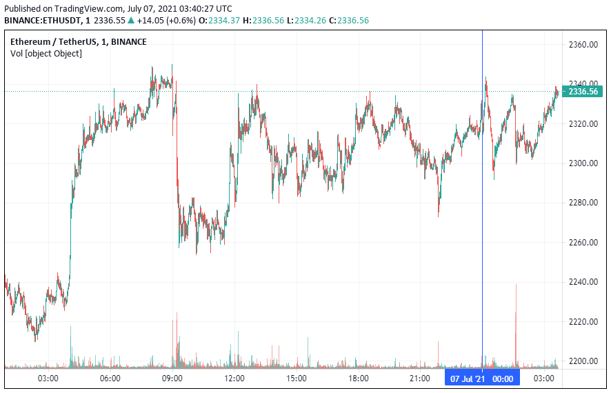 Вторая по капитализации криптовалюта – Ethereum – также начала день с боковика. По состоянию на момент написания новости, монета торгуется по $2336.