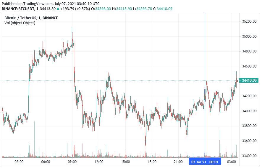 Биткоин (BTC) начал среду с бокового движения. По состоянию на 06:40 (МСК), криптовалюта торгуется по $34 410.