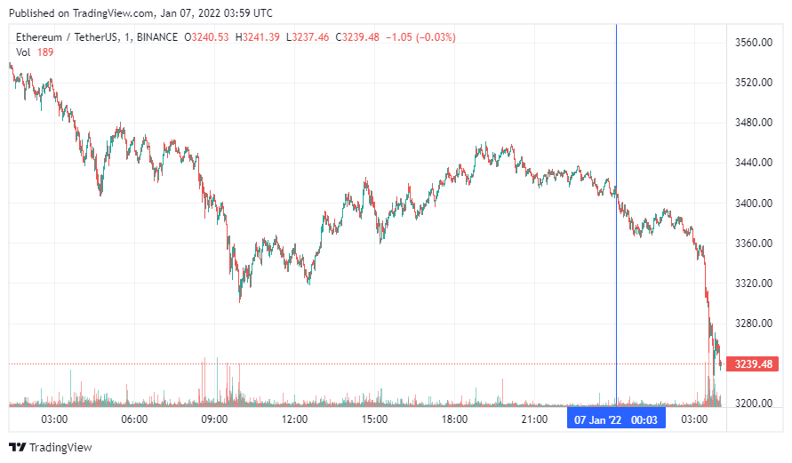 Вторая по капитализации криптовалюта Ethereum также начала день с падения. По состоянию на момент написания новости, монета торгуется по $3239.