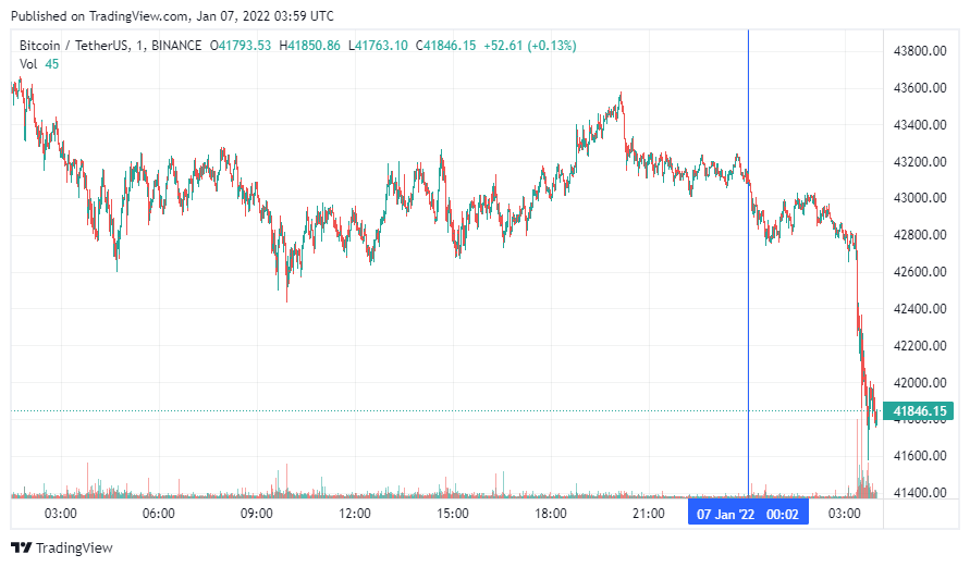 Биткоин (BTC) начал пятницу с падения. По состоянию на 07:00 (МСК), криптовалюта торгуется по $41 846. Максимум стоимости монеты за 24 часа, по данным ресурса CoinMarketCap, зафиксирован на уровне $46 929, минимум BTC обновляет в момент написания новости.