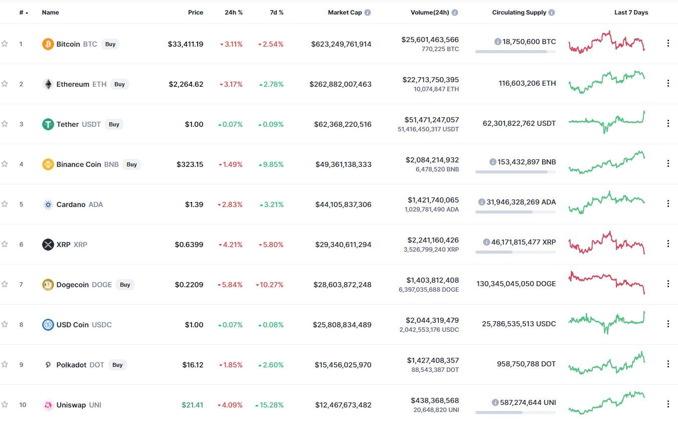 Sponsored SponsoredВ топ-10 самых капитализированных криптовалют все монеты, за исключением стейблкоинов Tether и USD Coin, продемонстрировали отрицательную динамику движения в течение 24 часов. Наибольшие потери за сутки зафиксированы у Dogecoin (-5,84%). Также криптовалюта активнее других теряла в стоимости в течение недели (-10,27%). Лучший результат роста за последние 7 дней зафиксирован у Uniswap (+15,28%).