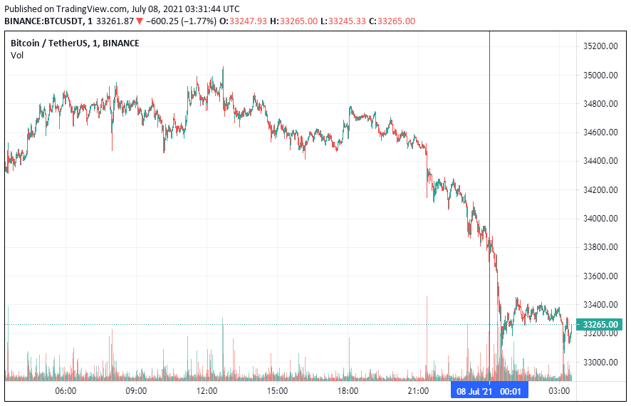 Биткоин (BTC) начал четверг с падения. По состоянию на 06:32 (МСК), криптовалюта торгуется по $33 265. Еще вчера курс BTC находился близ уровня $35 тыс.