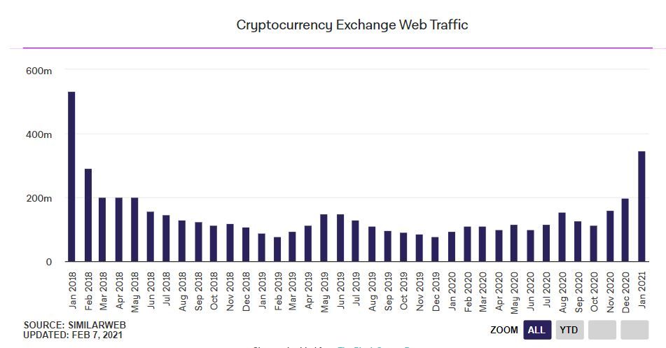 - В январе криптовалютами интересовалось больше людей, чем обычно. Об этом, со ссылкой на прирост трафика биржи цифровых активов, пишет The Block.