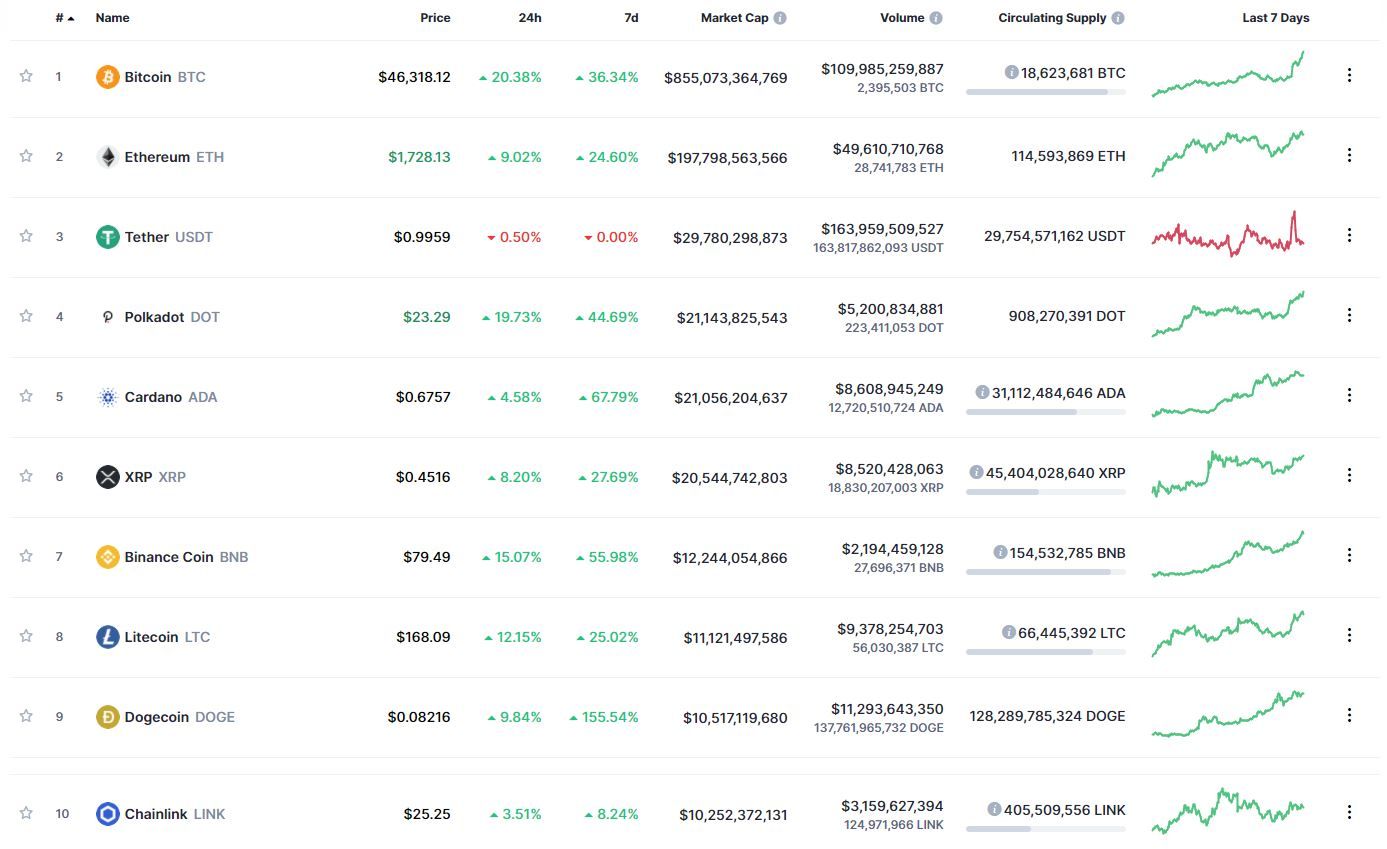 В ночь с понедельника на вторник самая капитализированная криптовалюта – биткоин (BTC) – обновила максимум стоимости на высоте $47 131 (по данным ресурса CoinMarketCap). За сутки монета выросла на 20,38%. Результат оказался лучшим среди топ-10. За неделю BTC подорожал на 36,34%. Биткоин резко вырос, когда стало известно, что компания американского бизнесмена Илона Маска Tesla купила BTC на 1,5 млрд долларов.