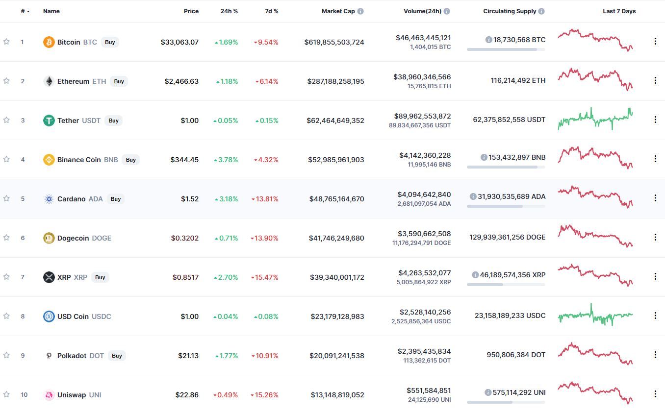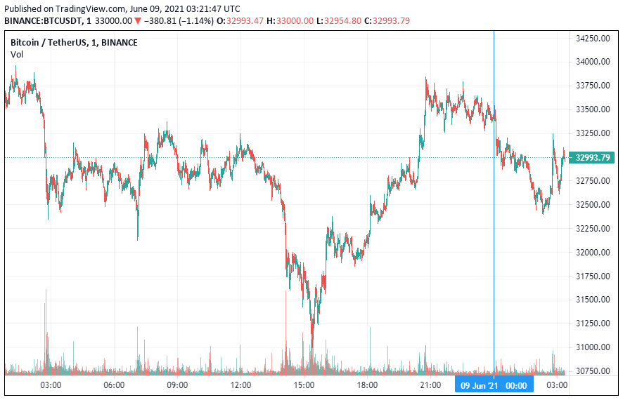 Биткоин (BTC) начал день с небольшого падения, которому предшествовало восстановление криптовалюты после снижения до уровня $31 тыс. По состоянию на 06:23 (МСК), монета торгуется по $32 993.