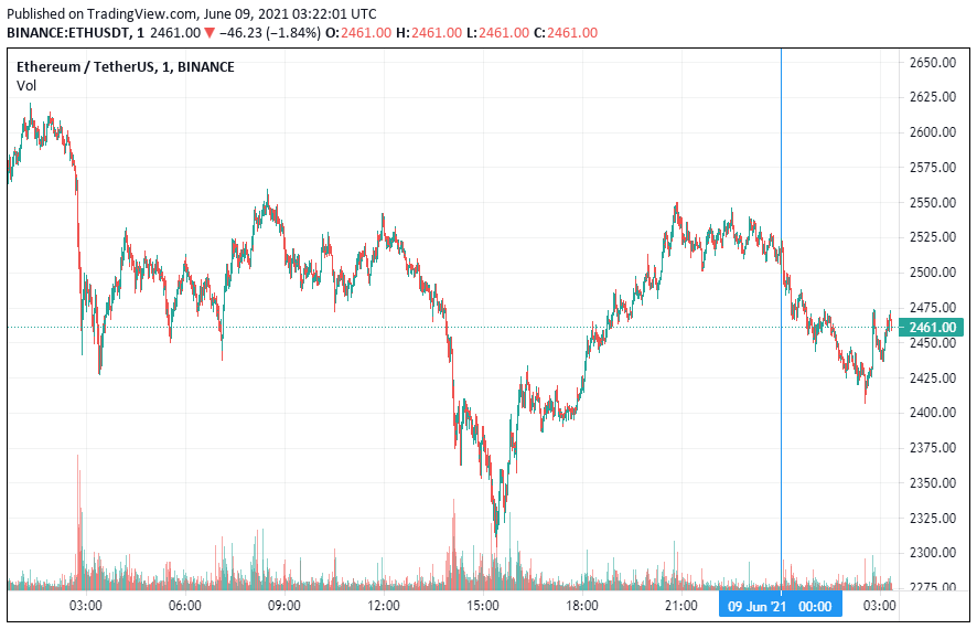 Вторая по капитализации криптовалюта – Ethereum – также начала день с небольшого падения. По состоянию на момент написания новости, монета торгуется по $2461.