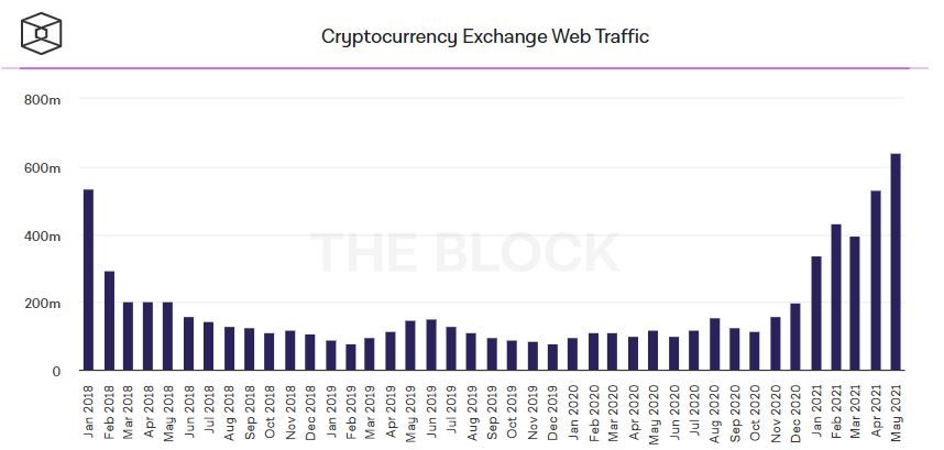 - Веб-трафик криптобирж в мае этого года обновил абсолютный максимум на уровне 638,2 млн посетителей. Об этом пишет The Block.