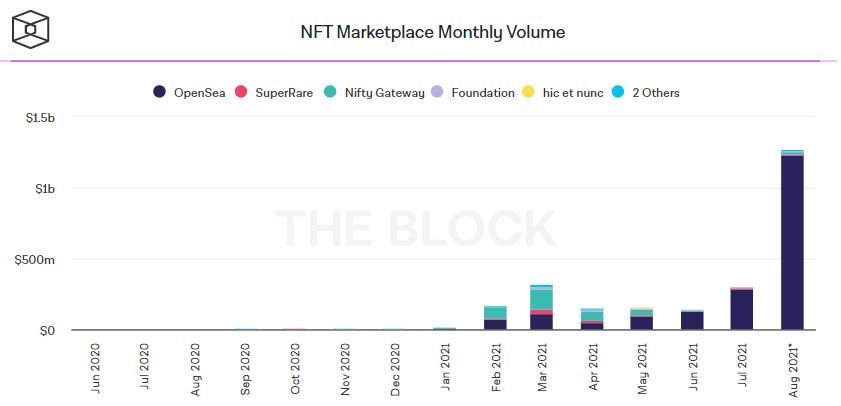 Аналитики обратили внимание на то, что объем торгов на маркетплейсе в период с июля по август вырос на 286%. OpenSea занимает лидирующее положение на рынке продаж NFT-токенов с мая 2021 года.