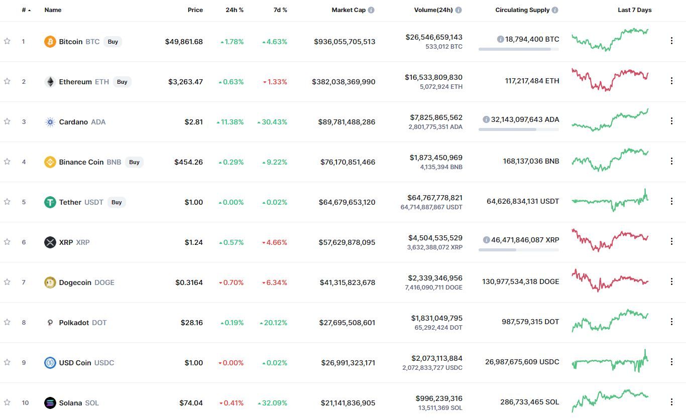 Биткоин (BTC) начал первый день новой рабочей недели со штурма уровня $50 тыс. По состоянию на 05:19 (МСК), криптовалюта торгуется по $49 795. Максимум стоимости биткоина за сутки, по данным ресурса CoinMarketCap, зафиксирован на уровне $49 939.