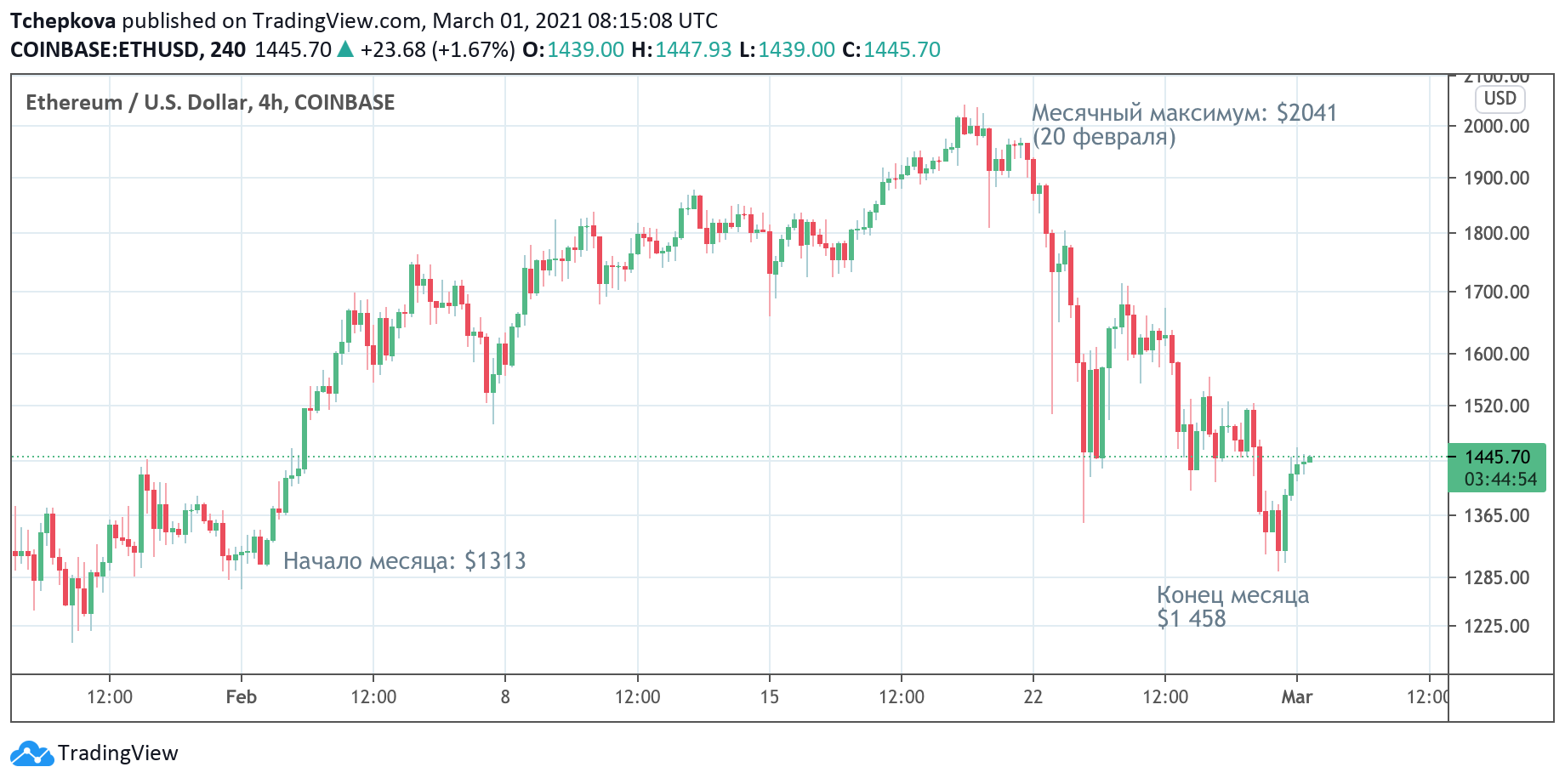 Рынок криптовалют начал февраль с позитивной динамики. Рыночная капитализация цифровых валют в обращении выросла с $1,02 трлн до $1,4 трон. Своего максимума в месячном интервале рынок достиг 21 февраля на отметке в $1,776 трлн.