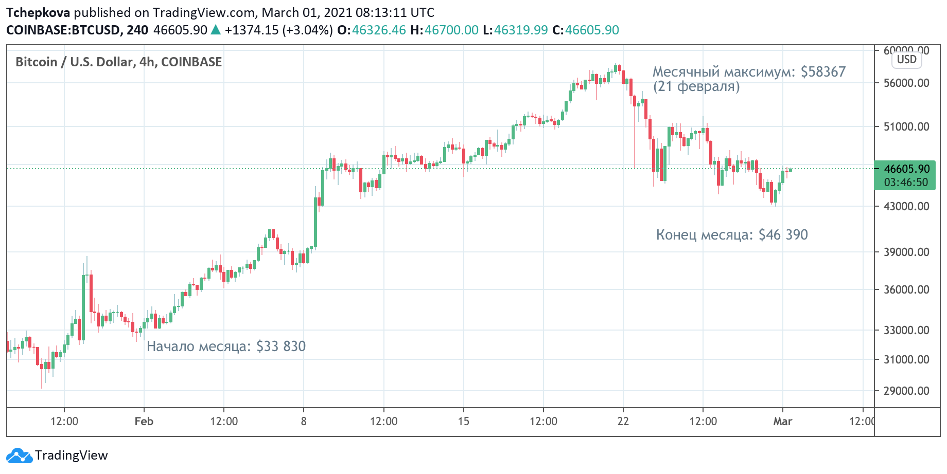 Похоже, что в феврале резервы биткоина на биржах прекратили свои сокращение. Впрочем, приток криптовалюты на биржевые кошельки все же произошел под конец месяца, когда биткоин обрушился от максимума в $58 367.