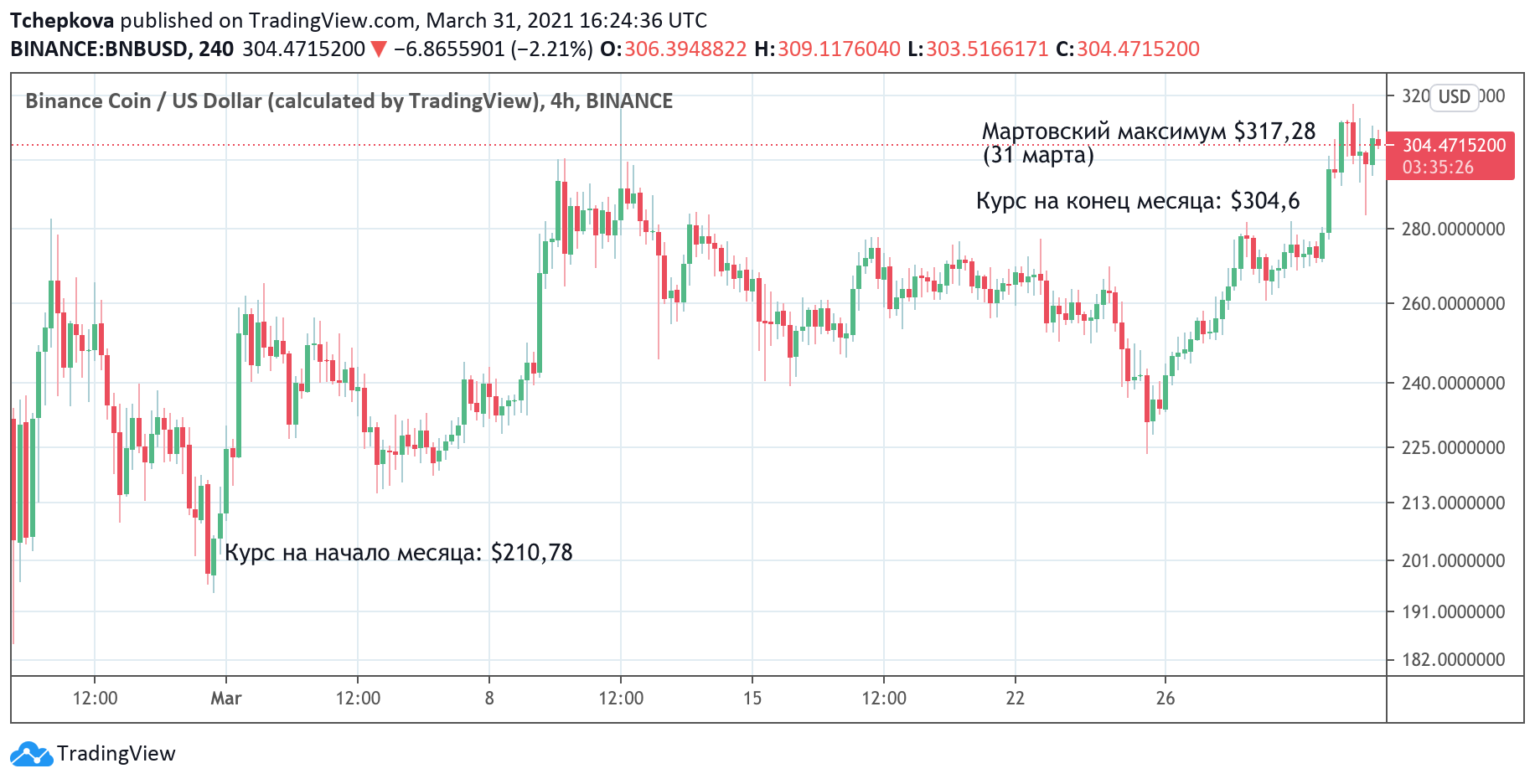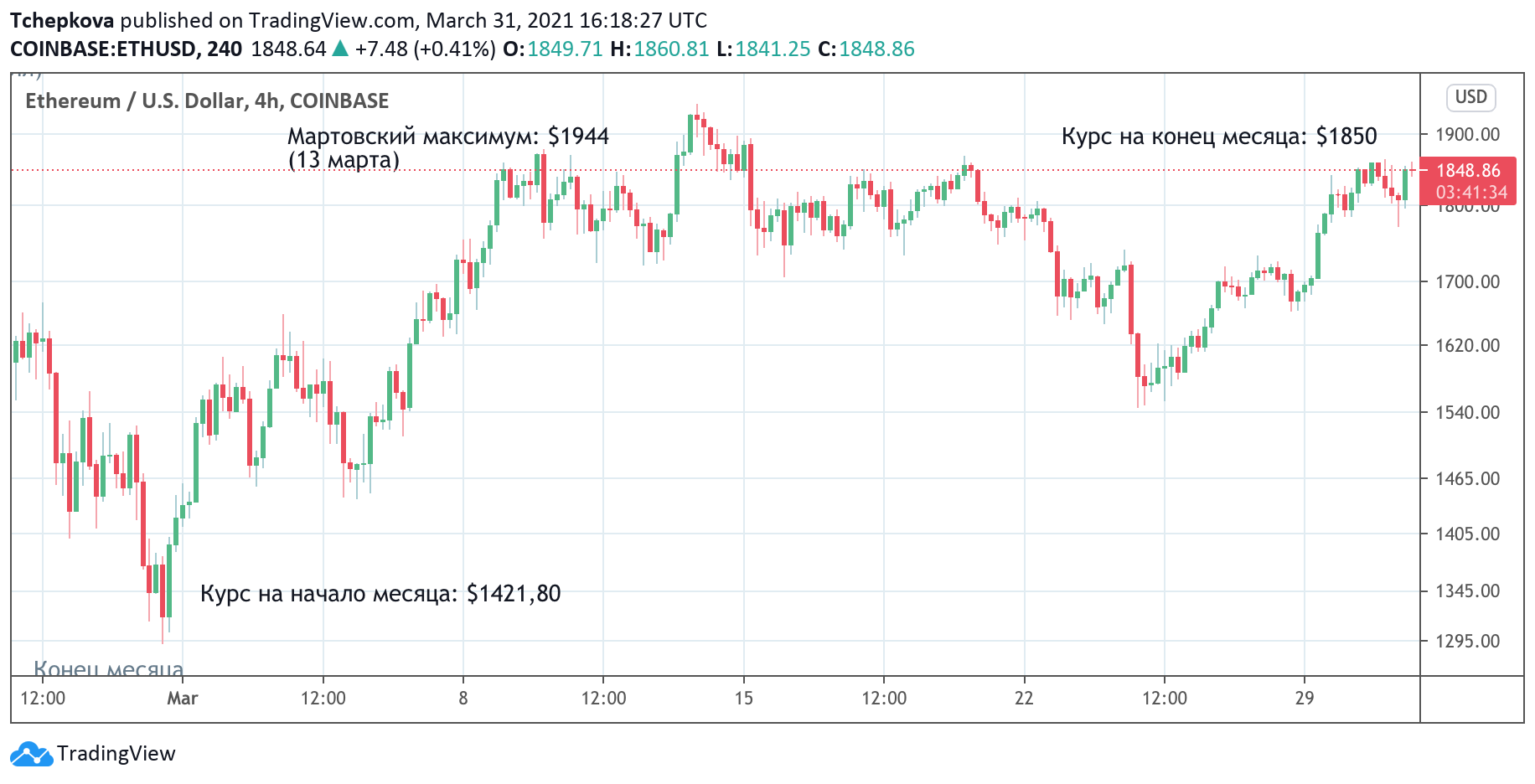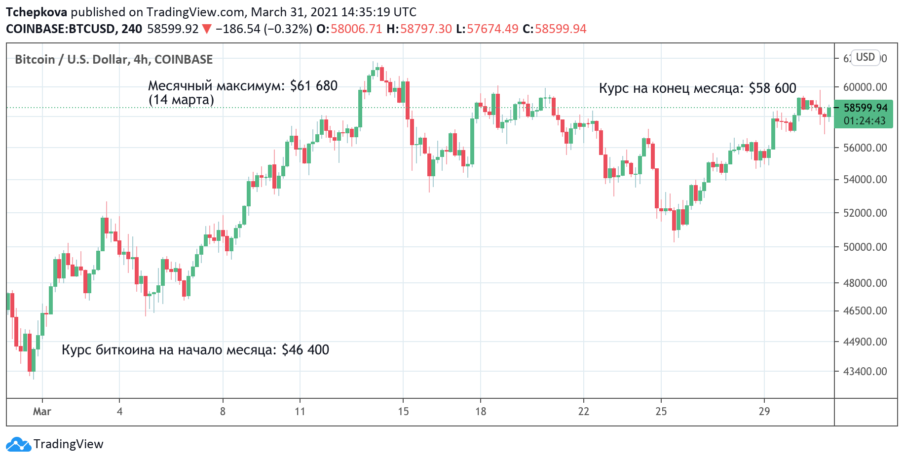 Начало марта выдалось особенно удачным для биткоина. Так, 9 марта, капитализация биткоина впервые за его историю перешагнула за порог в $1 трлн. Рыночная капитализация всех цифровых валют в обращении выросла с $1,3 трлн до $1,6 трлн. Своего максимума в месячном интервале рынок достиг 13 марта на отметке в $1,851 трлн.