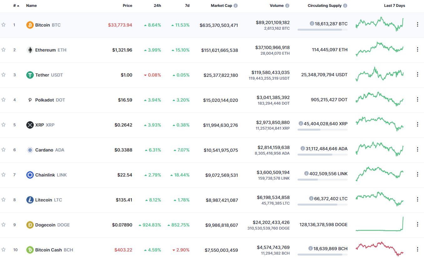 Все криптовалюты из топ-10 рейтинга капитализации ресурса CoinMarketCap завершают рабочую пятидневку ростом. По состоянию на 07:06 (МСК), биткоин (BTC) торгуется по $33 733. За сутки курс монеты вырос на 8,64%, за неделю – на 11,53%.