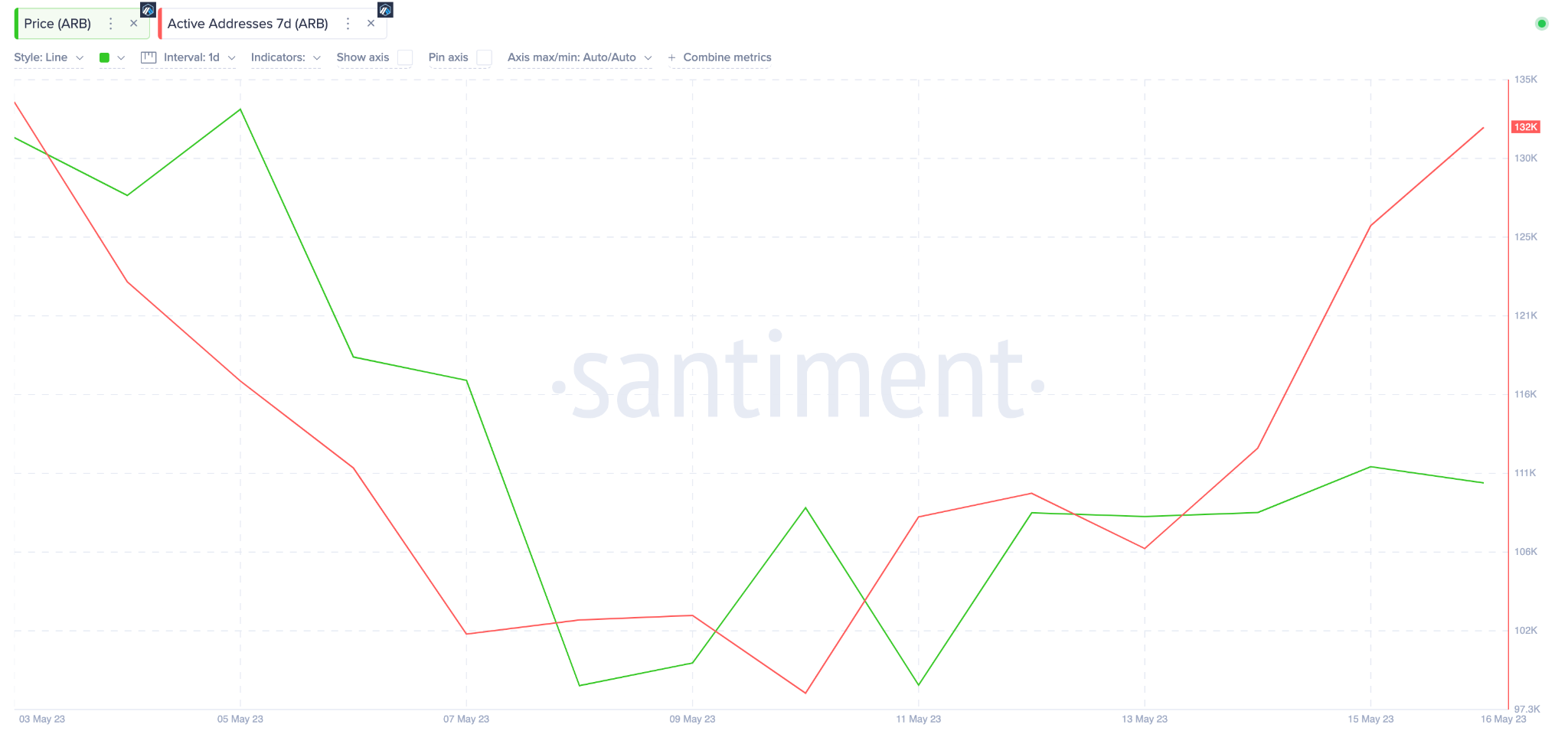 Рост интереса пользователей к блокчейну Arbitrum также можно расценивать в качестве бычьего сигнала. В период с 7 по 15 мая количество еженедельных активных адресов в сети увеличилось почти на 30% — с 101 000 до 131 000.