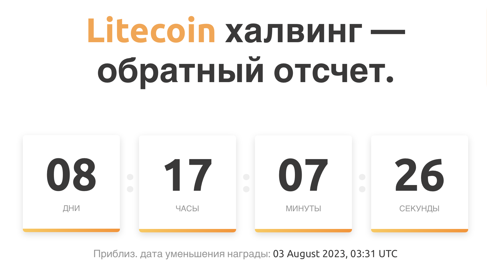 Халвинг Litecoin происходит после добычи 840 000 блоков — обычно этот процесс занимает около 4 лет. При запуске LTC в 2011 году вознаграждение майнеров за блок составляло 50 монет. После первого халвинга, который прошел в 2015 году, оно сократилось до 25, а еще через 4 года — до 12,5 LTC. Третий халвинг Litecoin, который намечен на 3 августа 2023 года, снизит вознаграждение за добычу блока еще в два раза — до 6,25 монет.