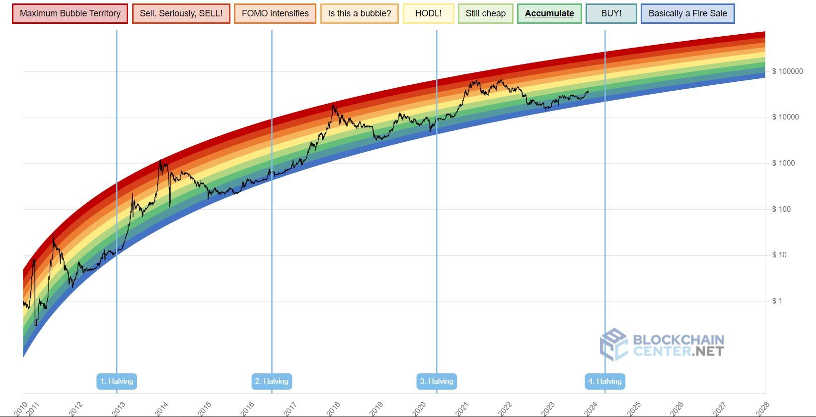 Визуализировать фазы наш собеседник предложил при помощи «радужного» графика биткоина. На нем черная кривая отражает движения курса BTC. Тело радуги позволяет понять, насколько высоким был курс монеты в каждый промежуток времени. Красная зона — высокая цена, синяя — низкая. Вертикальные линии — халвинги.