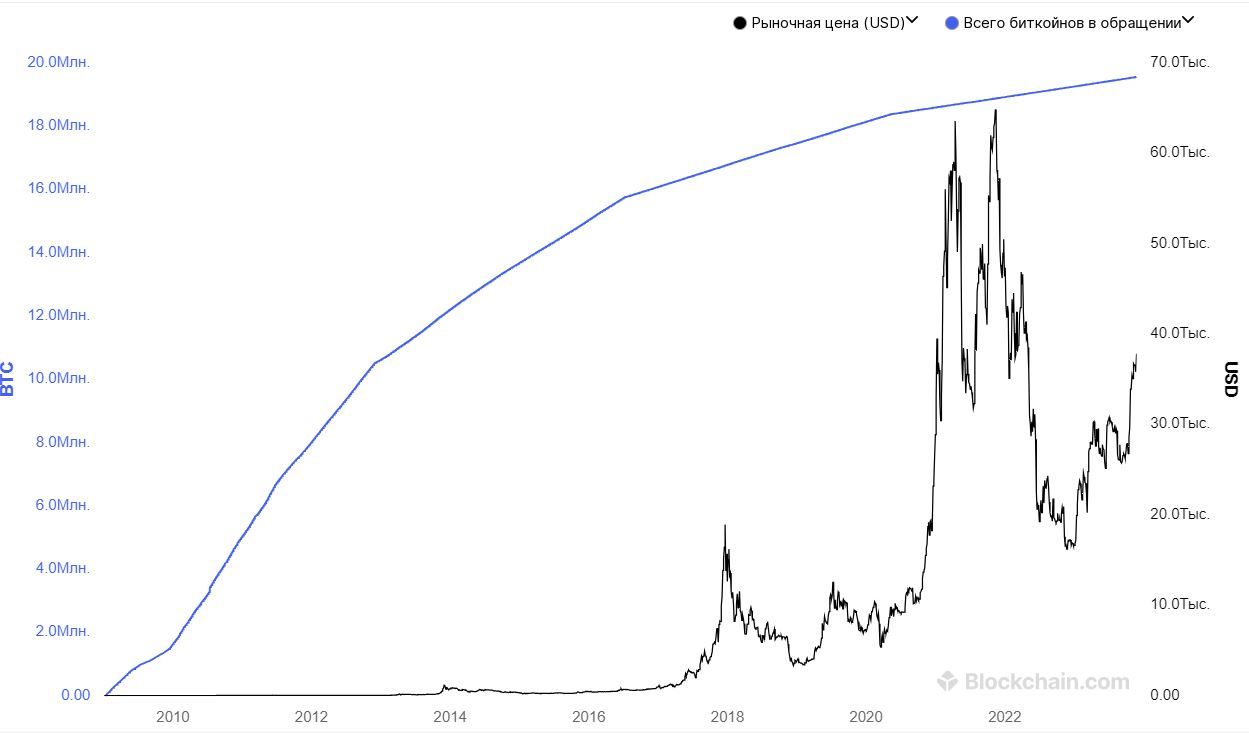 Уже добыто свыше 19,5 млн биткоинов. Каждый халвинг сокращает темпы добычи BTC и приток монет на рынок. При этом спрос на криптовалюту на фоне развития рынка цифровых активов растет. Таким образом искусственный дефицит BTC, в основе которого ограниченная эмиссия и халвинги, толкает курс криптовалюты вверх.