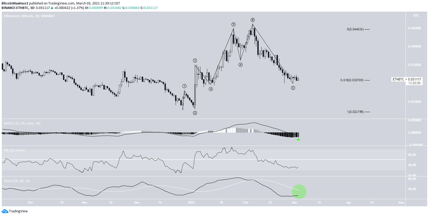 В настоящее время ETH торгуется на ₿0,03 вблизи 0,618 коррекции Фибоначчи относительно последней волны роста.