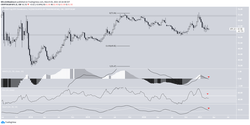 BTCD консолидировался в диапазоне 60-64% с начала февраля, но так и не смог закрепиться выше.