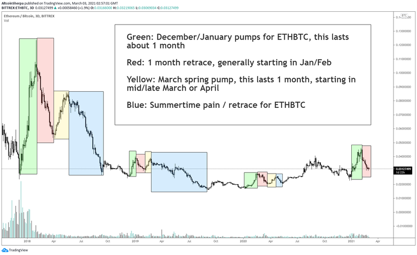 Криптовалютный трейдер @Altoinsherpa привел график ETH/BTC, отметив, что исторически пара росла в марте-апреле и, вероятно, сделает то же самое на этот раз.