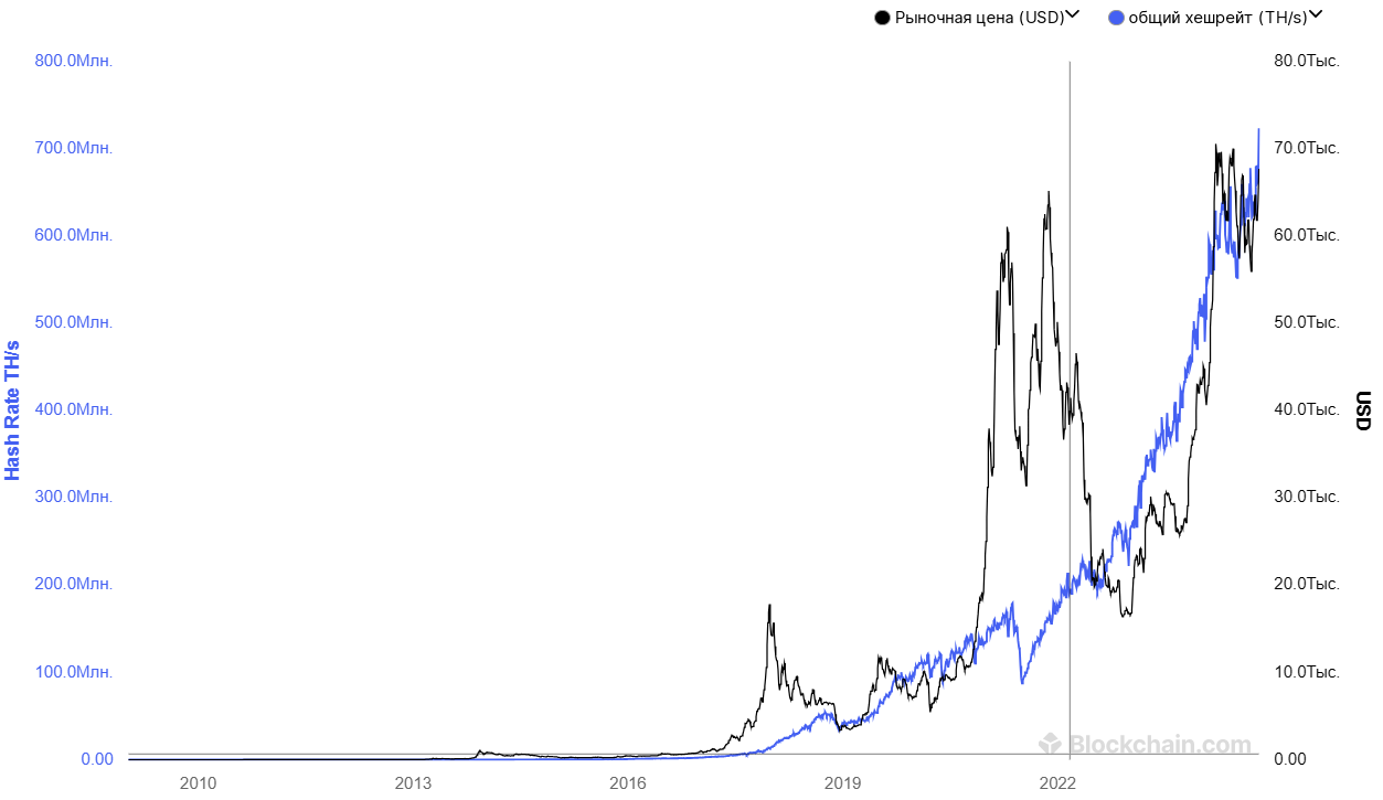 Совокупный объем вычислительных мощностей, которые майнеры подключили к сети биткоина, называют хешрейтом. Благодаря соперничеству сторон на рынке добычи криптовалют сохраняется равновесие – ведь все работают примерно на одном и том же оборудовании.