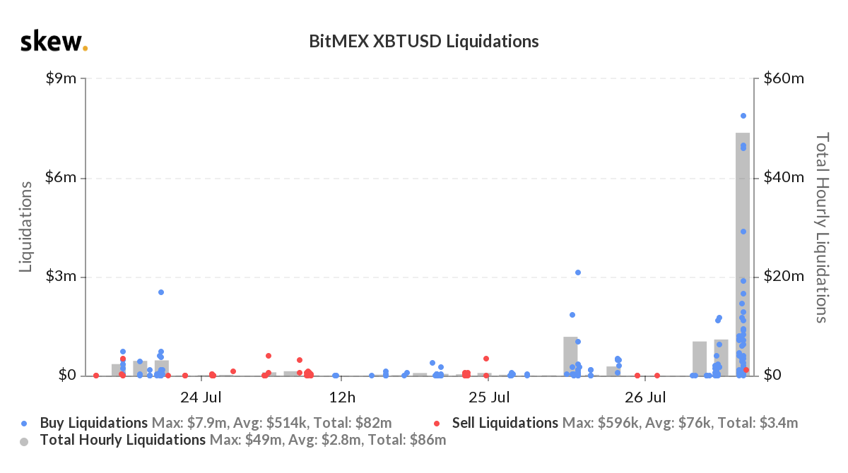 Одна из возможных неожиданного роста биткоина с таким же резким откатом — ликвидация коротких маржинальных позиций на биржах криптовалютных дериватоивов с последующей фиксацией прибыли по лонгам на прорыве ключевого сопротивления. По данным аналитического сервиса Skew.com, отслеживающего статистику по криптовалютным деривативам, на BitMEX было ликвидировано позиций на сумму около 50 млн долларов. Это самая масштабная ликвидация за последние несколько недель.