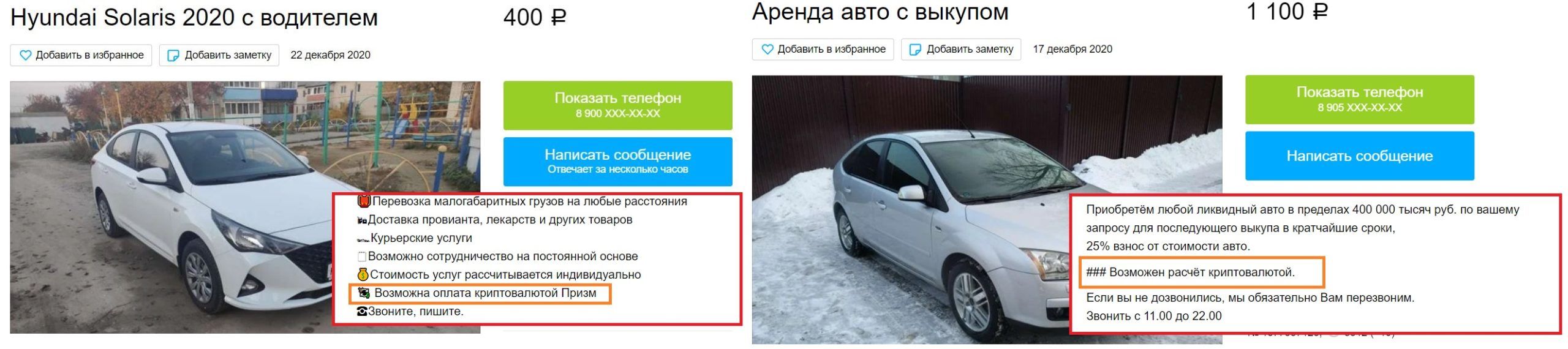 Примечательно, что некоторые продавцы принимают к оплате не только самые капитализированные криптовалюты, но и другие, менее популярные монеты. Например, автор объявления о сдаче авто Hyundai Solaris в аренду согласен на Prizm – криптовалюту проекта, который подозревают в мошенничестве.