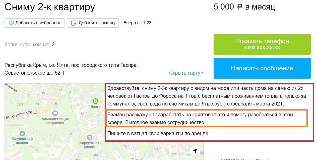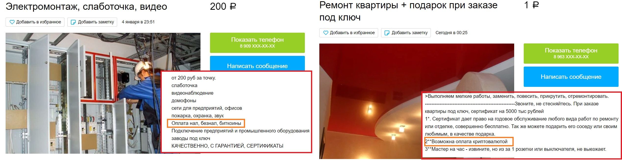 Иногда в сети встречаются странные объявления, которые тем или иным образом связаны с криптовалютами. Один из примеров – на скрине ниже. Его суть заключается в следующем: