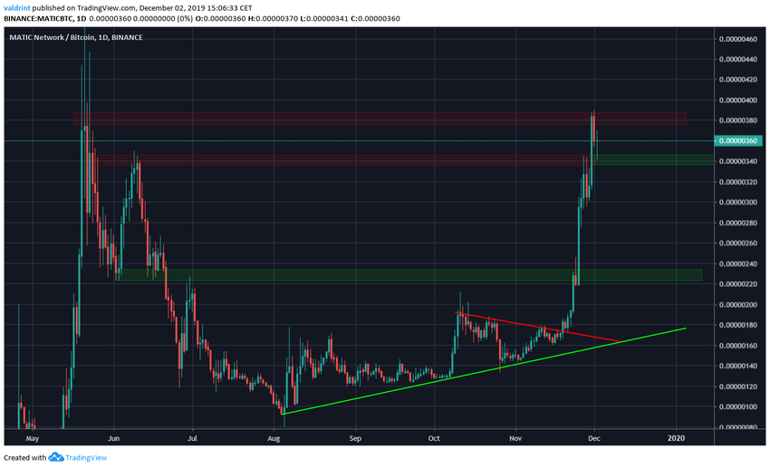 Она стремительно пробила две области сопротивления, на 230 и 345 сатоши, после чего достигла третьей области на 385 сатоши. Отсюда цена немного отступила.