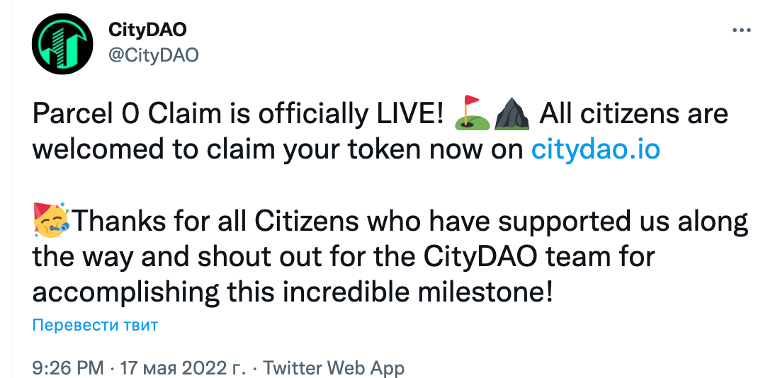 Эмиссия стартовала 17 мая. Заявка на NFT Parcel 0 будет бесплатной, хотя пользователь должен будет заплатить за транзакцию на блокчейне Ethereum. Принять участие в дропе может только тот, у кого есть гражданство CityDAO.
