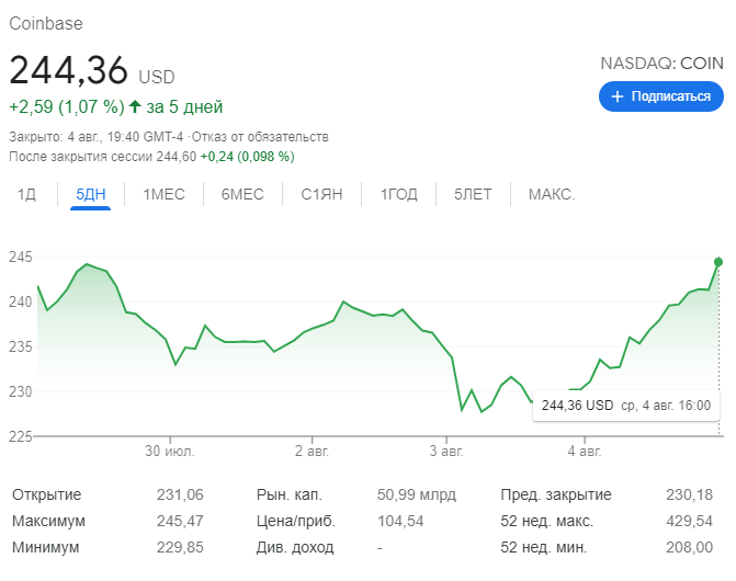 На фоне новостей о покупке цена акций Coinbase (COIN) подскочила более чем на 6%. На момент написания материала стоимость акции COIN составляет $244,36.