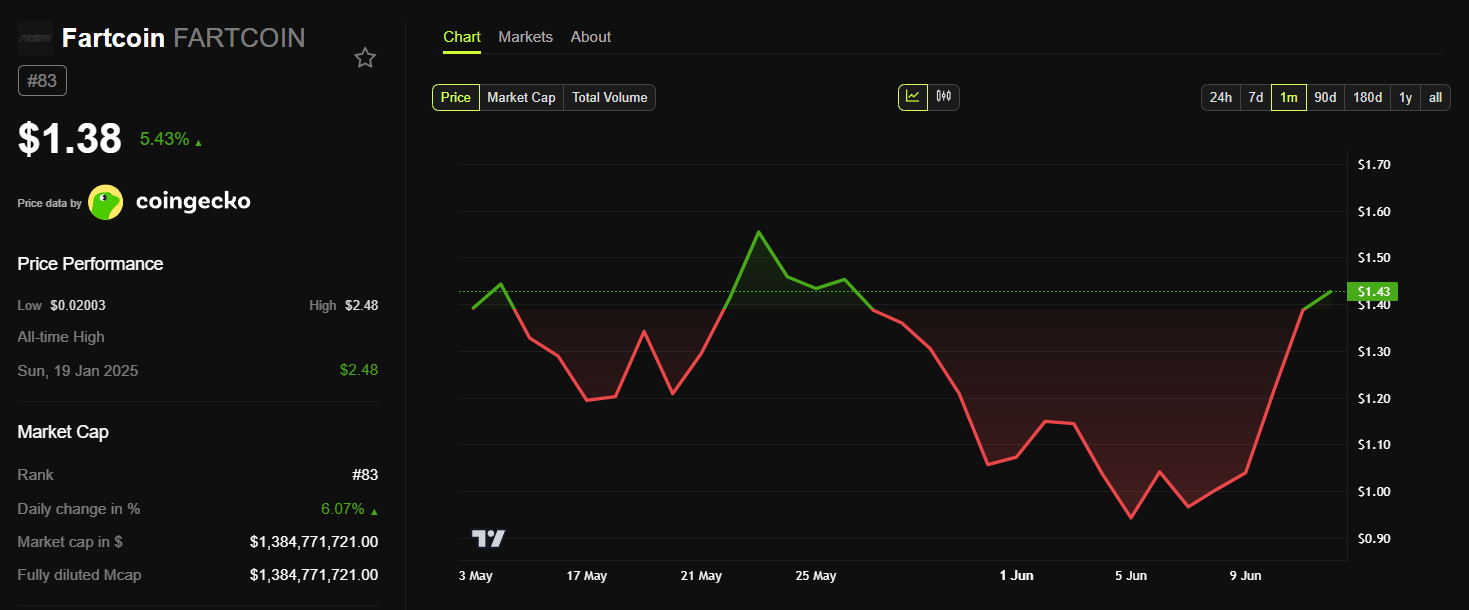 Тем временем Fartcoin пережил обвал цен в начале июня, хотя почти достиг новых высот в предыдущем месяце. Когда Coinbase включила мемкоин в свой план листинга, это создало сильный импульс. Сегодня ситуация не изменилась: Fartcoin подскочил, прибавив 6% за последние 24 часа.