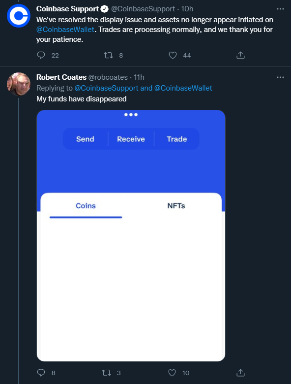 Выяснилось, что многие владельцы Coinbase Wallet попросту лишились доступа к кошелькам из-за глобальных неполадок с котировками. Представители биржи не стали прямо называть причину сбоя. Помимо Coinbase, под удар попал также кошелек Trust Wallet.