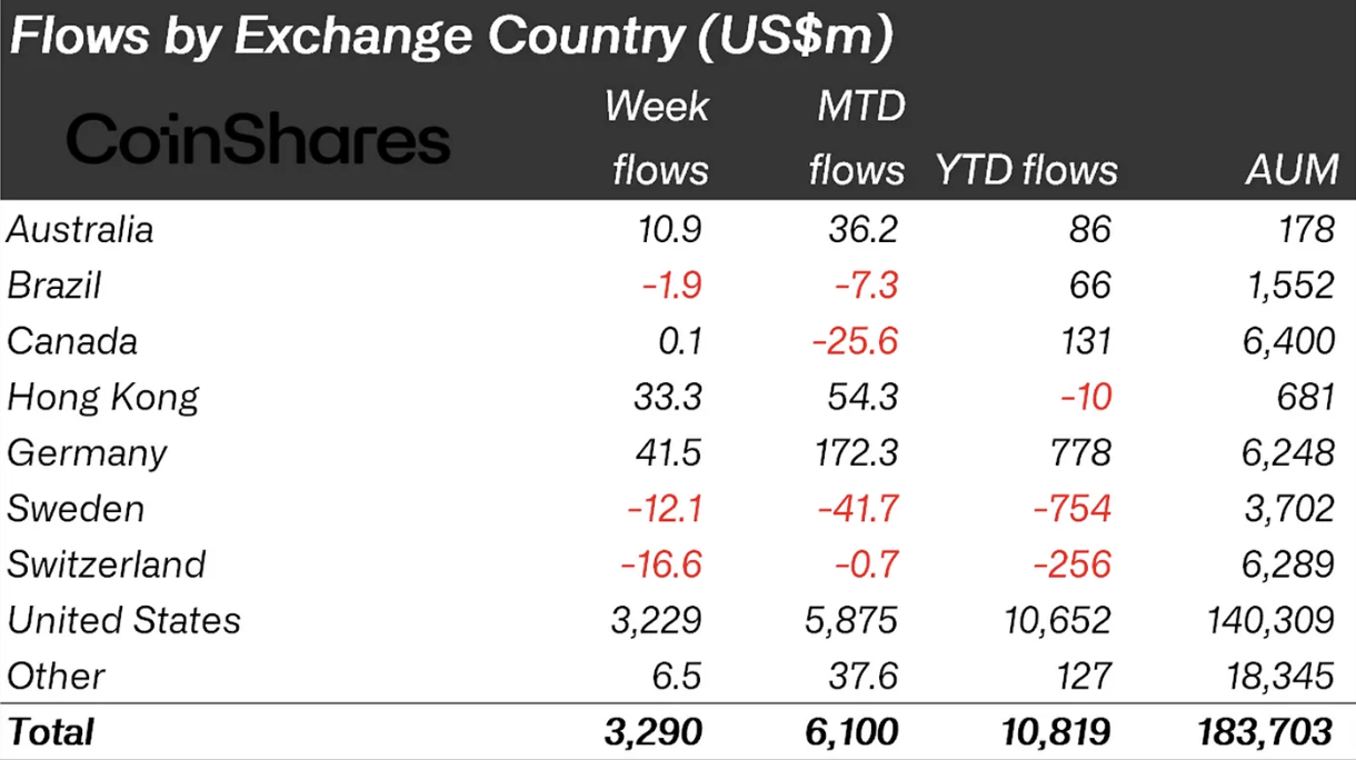 Большая часть притока пришлась на Соединенные Штаты — $3,2 млрд, что составило 97% от общего объема. На Германию, Австралию и Гонконг пришлось $41,5 млн, $10,9 млн и $33,3 млн соответственно. Швейцария стала единственным регионом, который зафиксировал оттоки на $16,6 млн. На прошлой неделе, когда цена биткоина (BTС) обновила исторический максимум, швейцарские инвесторы фиксировали прибыль.