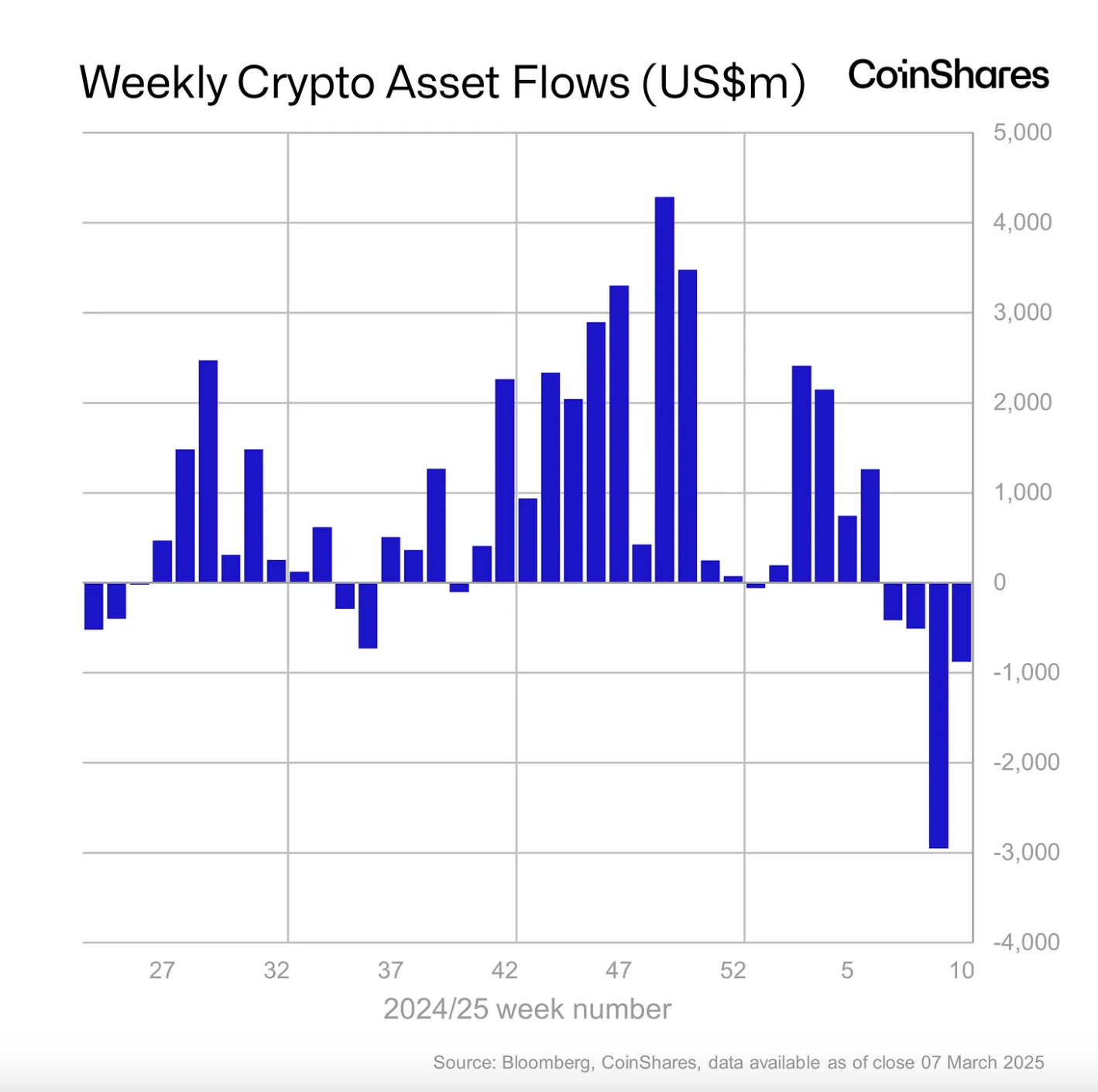 На прошлой неделе — с третьего по седьмое марта — из инвестиционных продуктов на базе криптовалют вывели $876 млн