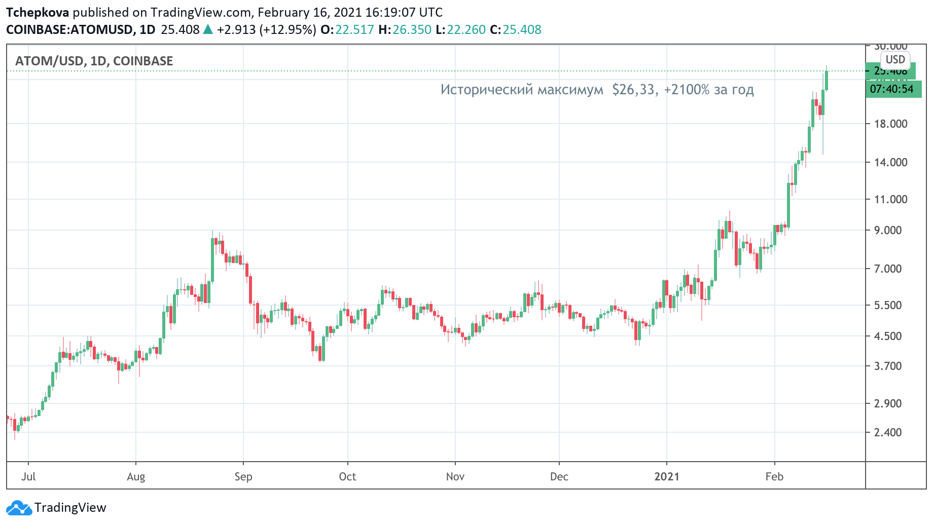 Пока все пристально следят за биткоином, в мире альткоинов происходит кое-что интересное. Криптовалюта ATOM за минувшие сутки обновила исторический максимум в паре с долларом на высоте $26,33. За сутки монета подорожала более чем на 20%, а за две недели февраля — на 220%.