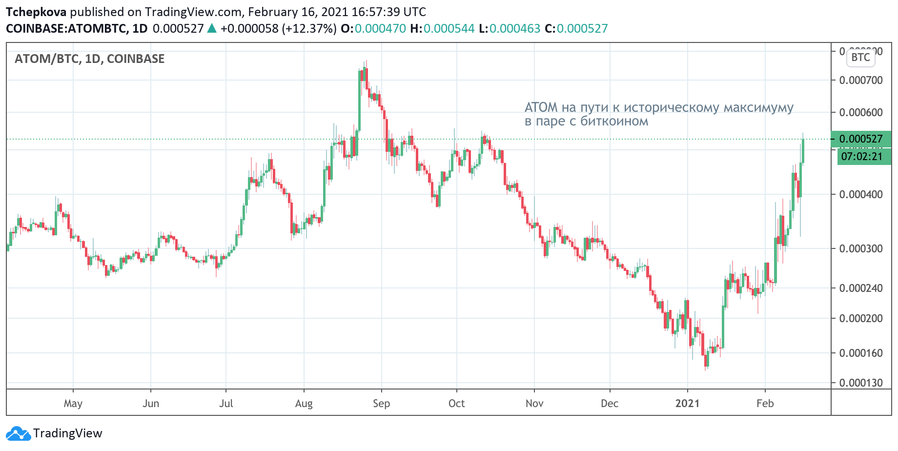 ATOM растет не только по отношению к доллару. В токен также активно укрепляться в паре с биткоином. ATOM/BTC сформировал дно 9 января 2021 года в области 0,00014. Сейчас один ATOM стоит 0,0005. Токен все еще далеко от своего исторического максимума в паре с битконом на уровне 0,00076. Однако текущий рост примечателен тем, что происходит на фоне взрывного роста главной криптовалюты.