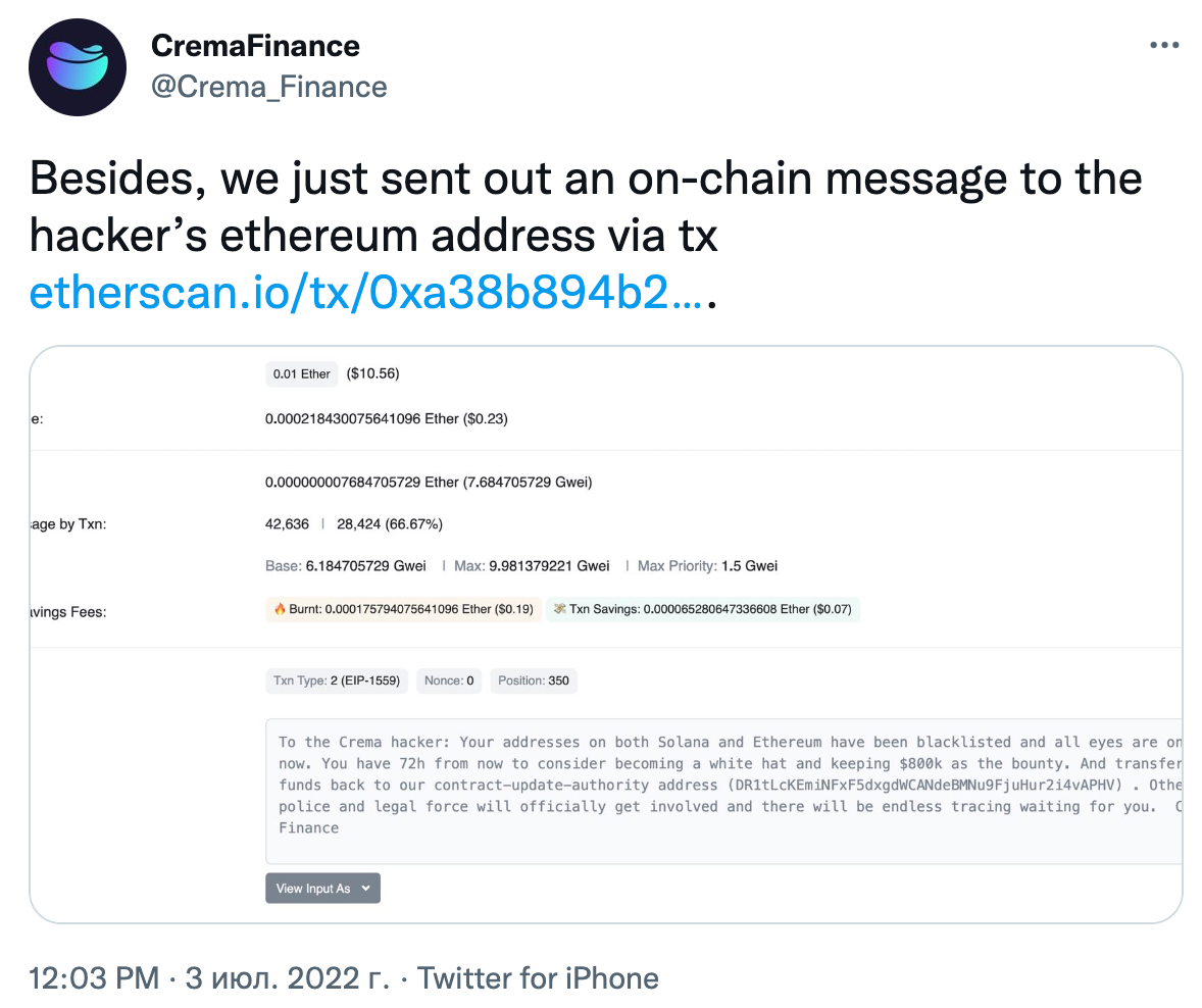 Кроме того, команда Crema отправила хакеру ончейн-сообщение на его Ethereum-адрес.