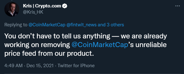 Криптовалютная компания Crypto.com откажется от «ненадежных» данных сервиса котировок CoinMarketCap (CMC). Об этом в комментариях под постом CMC в твиттере написал глава Crypto.com Крис Маршалек.
