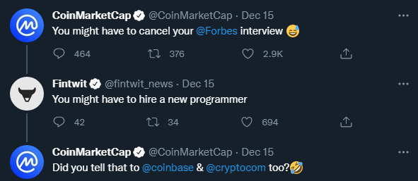 SponsoredВ ответ на это один из сервисов под названием Fintwit написал, что CoinMarketCap стоит нанять нового программиста. В CMC решили поддержать юмористичный тон переписки, ответив Fintwit, что с такими предложениями стоило бы обратиться и в Coinbase, а также Crypto.com.
