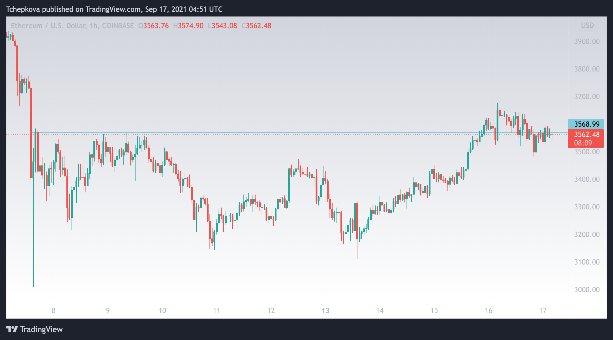 Вторая по капитализации криптовалюта – Ethereum — вернулся к пробитому ранее сопротивлению $3 570 и тестирует ее в качестве поддержки. За сутки курс ETH подешевел на 2,7%. За неделю укрепился на 2,8%. На момент публикации монета торгуется в районе $3 560.