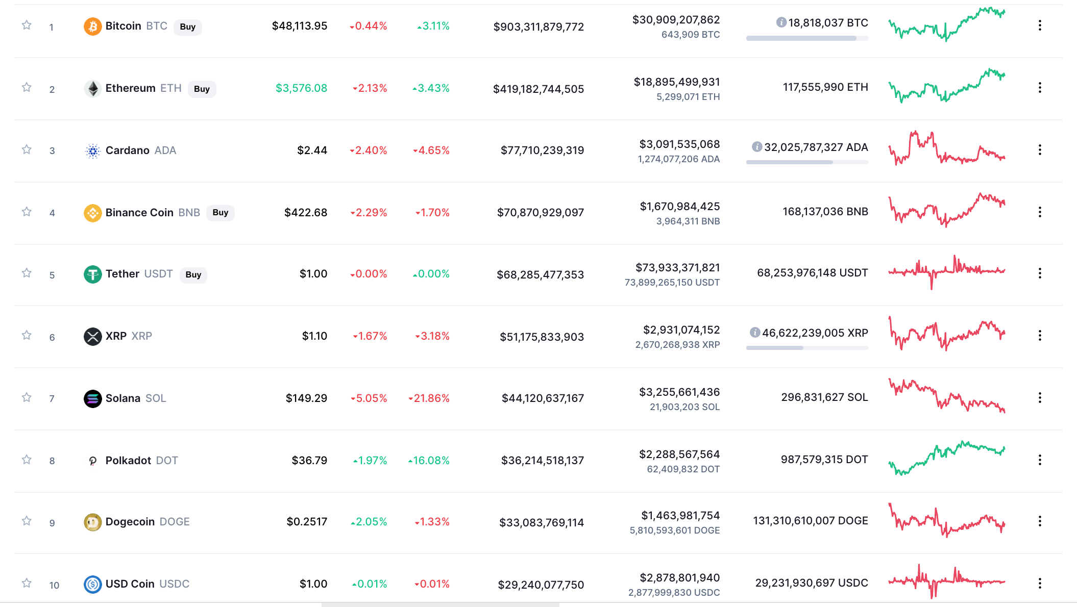 Sponsored SponsoredИз десяти самых капитализированных криптовалют лучший результат за минувшие сутки показал Dogecoin (DOGE), подорожавший на 2%. В недельном исчислении в лидерах роста остался токен Polkadot (DOT), который за 7 дней подорожал на 16%. В суточном и недельном интервале самые большие потери у Solana (-5% и -21% соответственно).