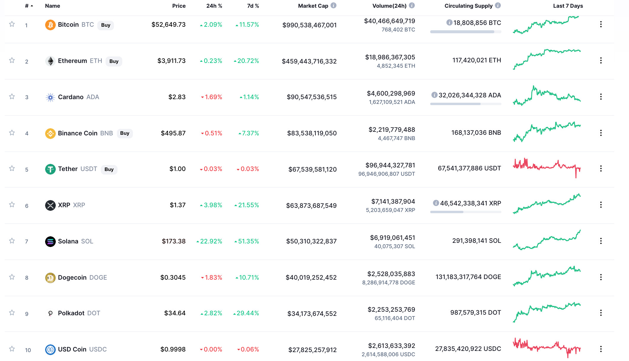 В топ-10 самых капитализированных криптовалют лидером роста за сутки и за неделю стал токен Solana (+22,9% и +51,3% соответственно). Наибольшие потери за сутки зафиксированы у Dogecoin (-1,83%). В течение недели все криптовалюты, за исключением стейблкоинов Tether и USD Coin, продемонстрировали позитивную динамику.