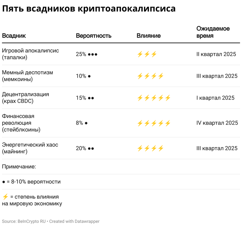 Вероятность реализации каждого отдельного прогноза невелика — от 8% до 25%. Но история криптовалют учит нас готовиться к любому повороту событий. Тем более что некоторые сценарии могут реализоваться одновременно, усиливая эффект друг друга.