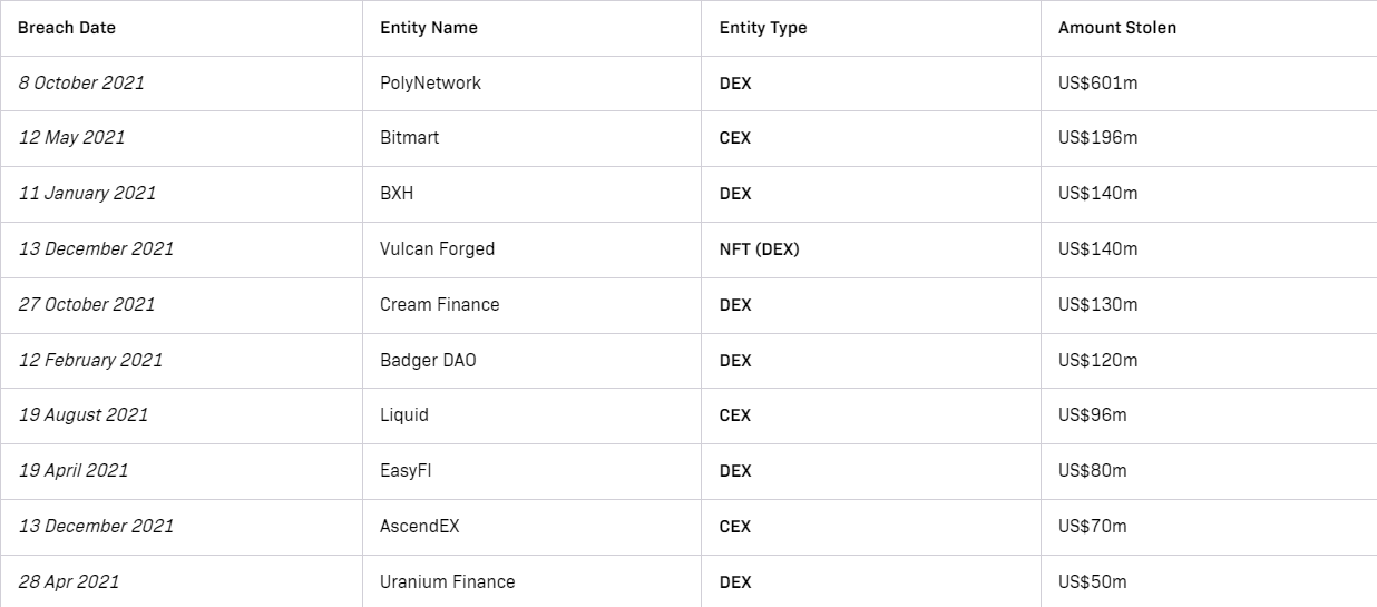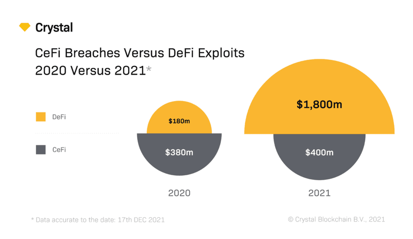 По подсчетам Crystal, количество атак на децентрализованные финансы (DeFi) в 2021 году выросло в 4,5 раза: с 14 атак в 2020 году до 63 атак в 2021 году. Кроме того, по сравнению с 2020 годом, в 2021 году убытки от взломов DEX’ов тоже увеличились в 12 раз.