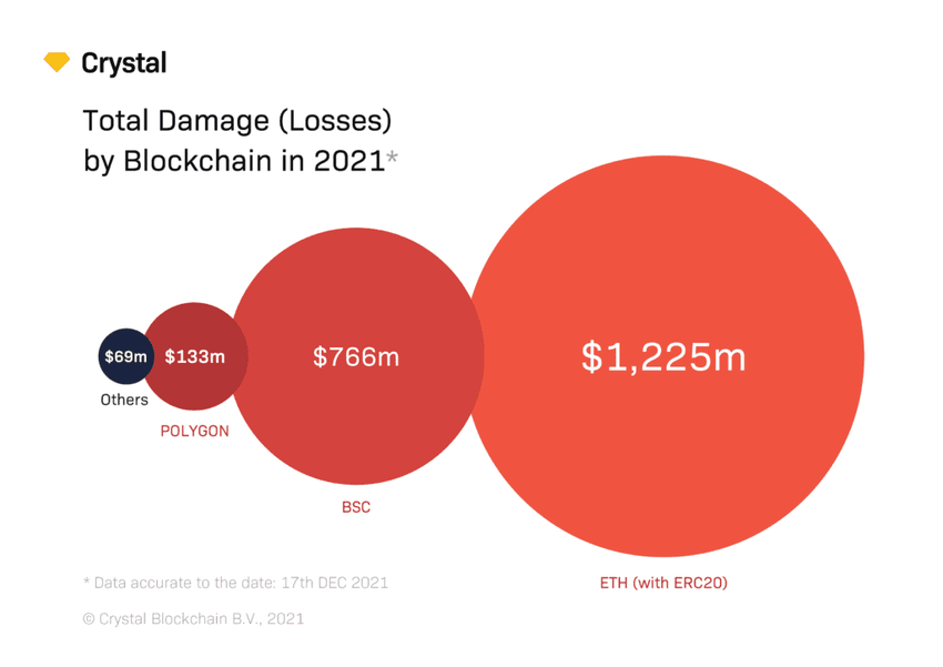 Блокчейн-сеть Ethereum пострадала больше всех в денежном эквиваленте по итогам 2021 года. Об этом у себя в блоге сообщили аналитики Crystal Blockchain. Согласно результатам исследования, на Ethereum пришлось $1,2 млрд потерь. На втором месте оказалась сеть Binance Smart Chain (BSC) с потерями на сумму в $766 млн. Тройку закрыл протокол масштабирования Polygon, который понес убытки на $133 млн.